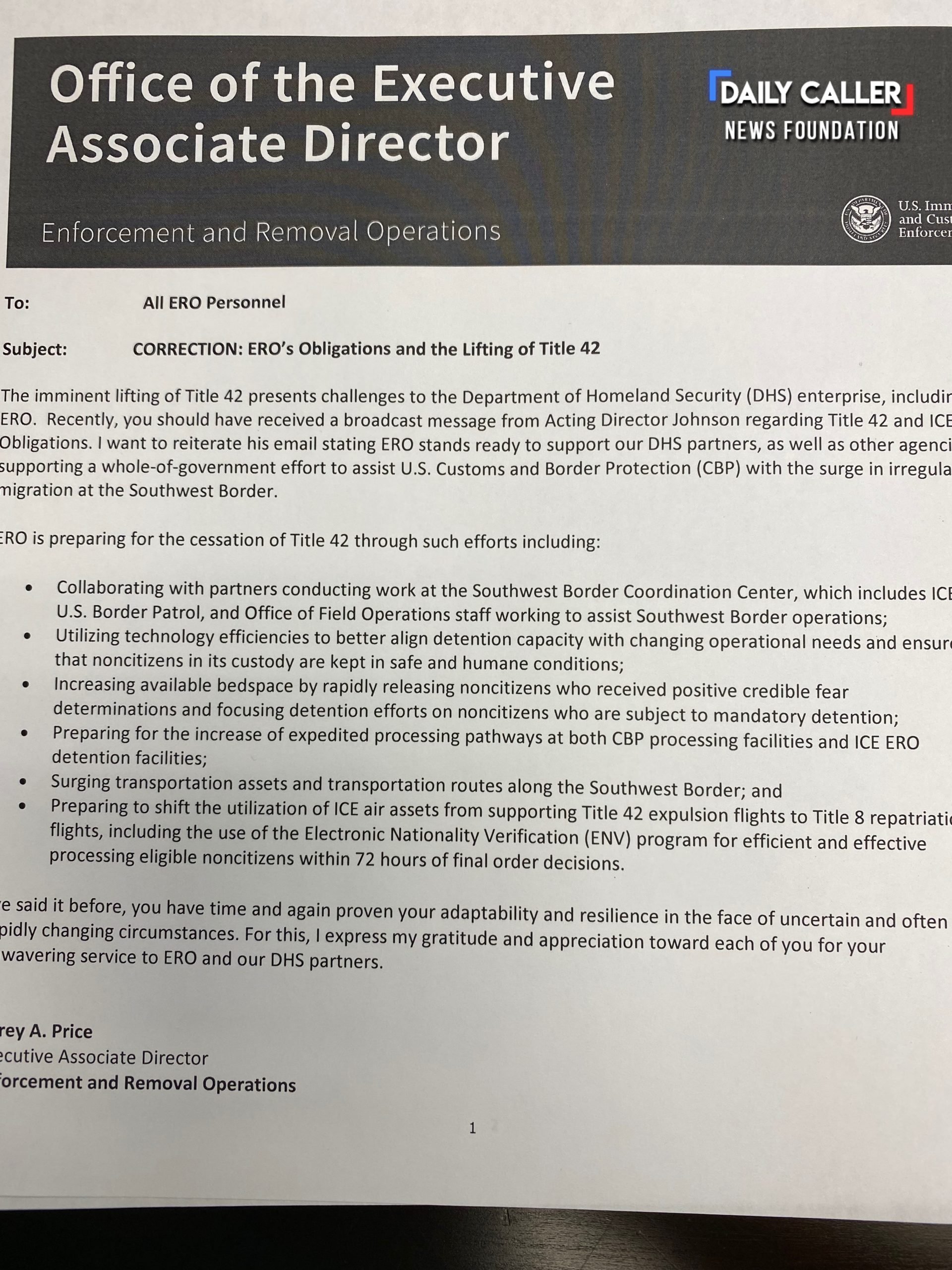 Federal authorities are being instructed to quickly release illegal immigrants who are found to have credible fears ahead of the sunset of Title 42, a Trump-era border policy set to end late Thursday, according to an internal Immigration and Customs Enforcement (ICE) memo obtained exclusively by the Daily Caller News Foundation.