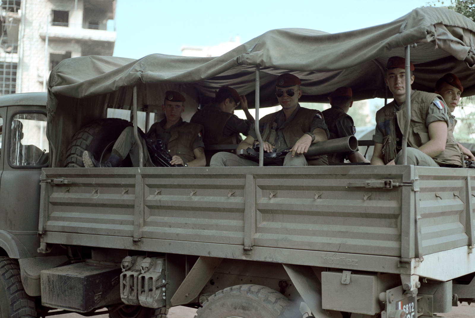 Members of a French military unit arrive at their encampment near a shell-damaged building. French troops and US Marines have been deployed in Lebanon as part of a multi-national peacekeeping force following confrontation between Israeli forces and the Palestine Liberation Organization.