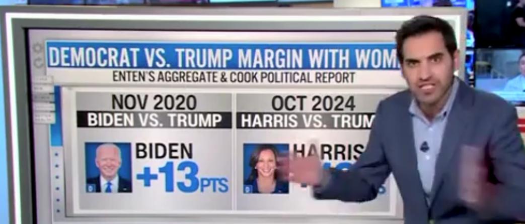 “This is the Democrat versus Trump margin, compare … four years ago … Trump won among male voters by just five points. Look at where we stand today. My goodness, gracious, Donald Trump doing considerably better among male voters, up by 12 points,” Enten said. “That’s a seven point swing in Donald Trump’s direction. Keep in mind that seven point swing because I want you to take a look at what’s going on with female voters.”