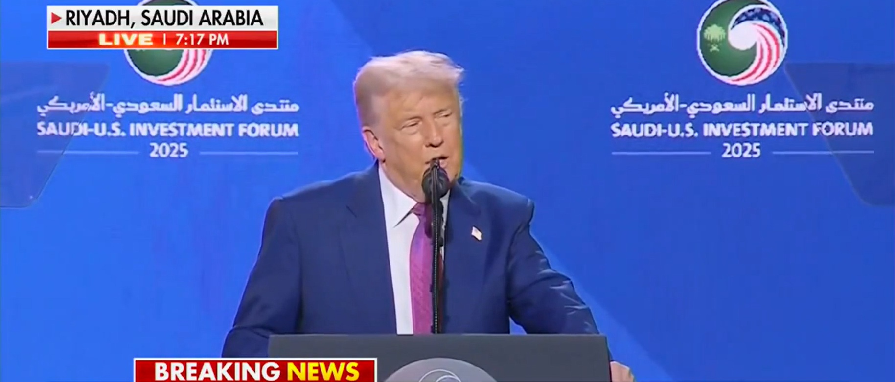 They’ve had their share of travesty, war, killing. Many years. That’s why my administration has already taken the first steps toward restoring normal relations between the United States and Syria for the first time in more than a decade,” Trump said to applause from the crowd. “And I am very pleased to announce that Secretary Marco Rubio will be meeting with the new foreign ministry in Turkey. After discussing the situation in Syria with the crown prince, your crown prince and also, with President [Recip Tayyip] Erdogan of Turkey, who called me the other day and asked for a very similar thing, among others and friends of mine, people who I have a lot of respect for in the Middle East. I will be ordering the cessation of sanctions against Syria in order to give them a chance at greatness.”